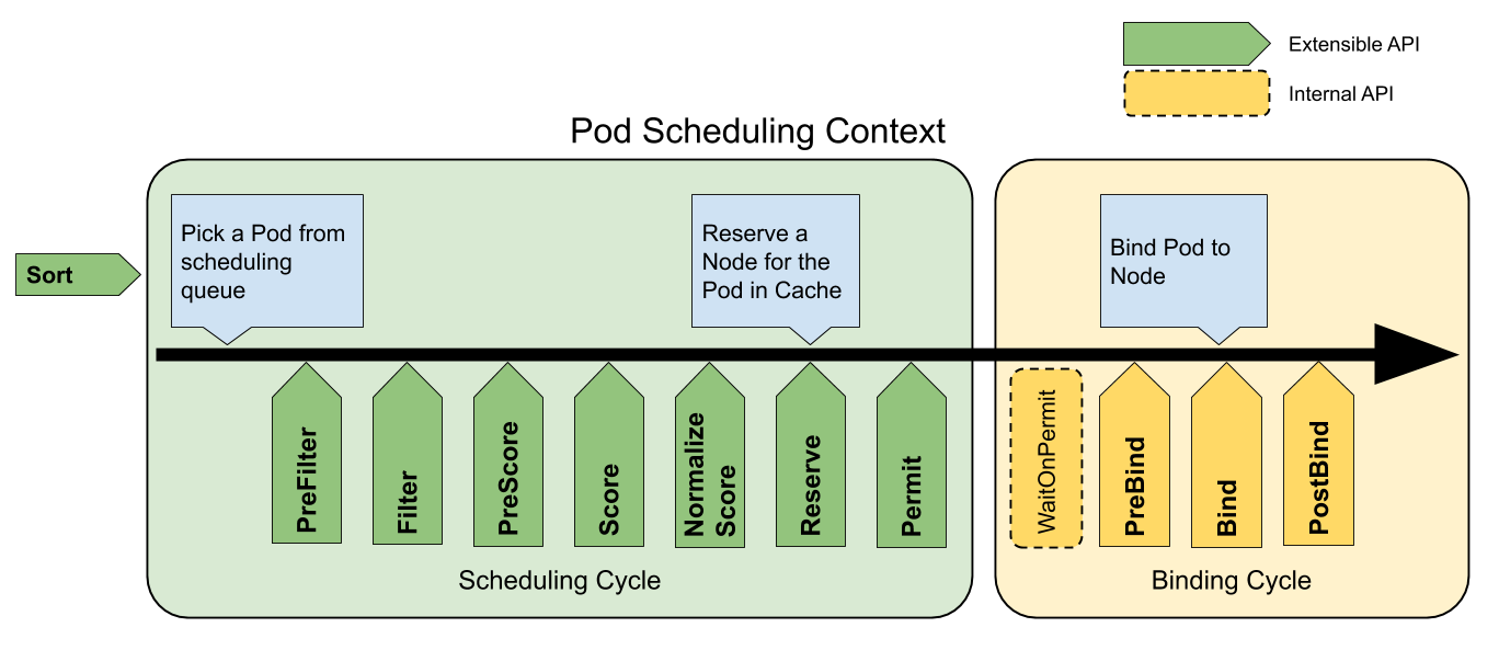 The following picture shows the scheduling context of a Pod and the extension points that the scheduling framework exposes. In this picture "Filter" is equivalent to "Predicate" and "Scoring" is equivalent to "Priority function".
